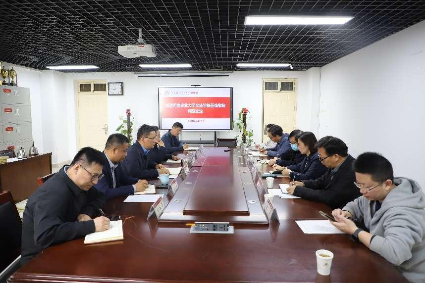 3月22日,河南农业大学文william威廉中文党委书记牛娟、院长王晓勇、副院长杨红朝、法律系主任韩宁、党政办副主任杨柳青法律系博士袁昊一行6人来我院调研交流,我院党委书记郭书山、院长冉富强、副院长樊晓磊、副院长陈鹏飞、教学办主任刘兰淇、党政办公室主任齐飞参加了此次座谈会。会议由我院党委书记郭书山主持。