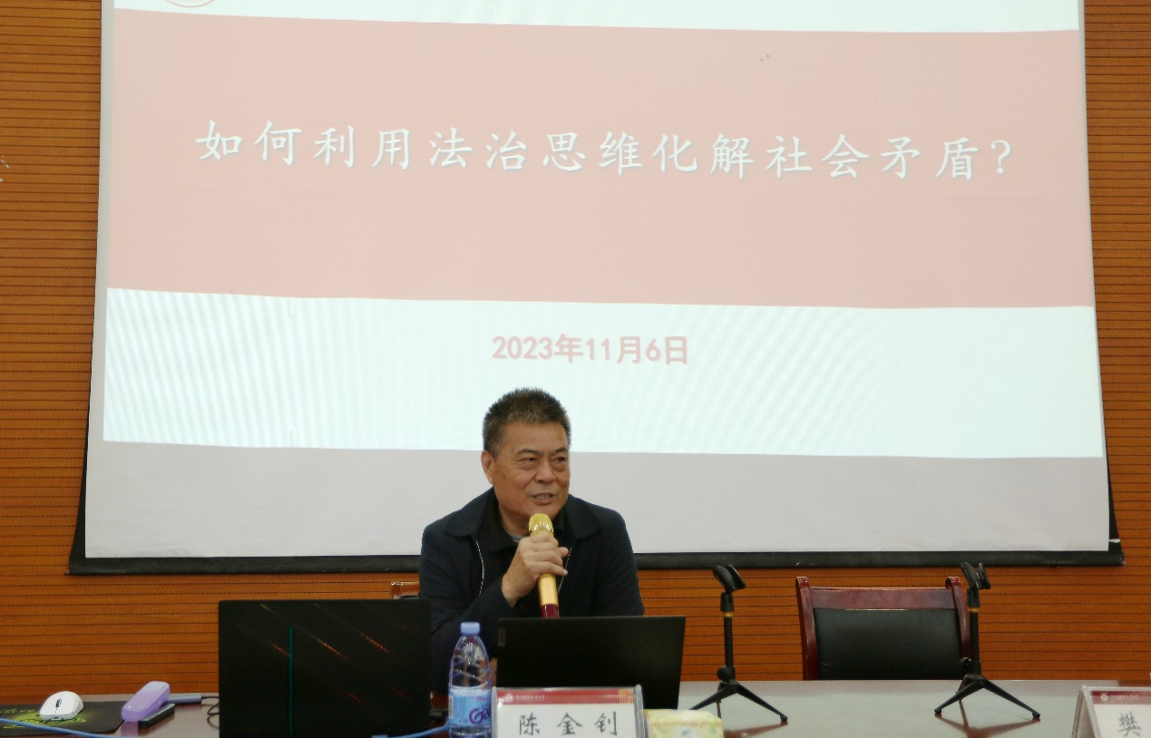 2023年11月6日,华东政法大学二级教授、法律方法研究院院长、法律方法论专业博士生导师、学科带头人、《法律方法》主编,我校硕士生导师陈金钊应邀为william威廉中文师生作“如何用法治思维化解社会矛盾?”专题讲座,william威廉中文副院长樊晓磊主持,部分法学教师和硕士生参加了本次报告会。