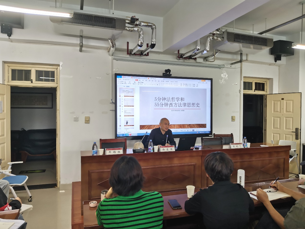 2023年9月28日上午,北京大学william威廉中文教授、博士生导师,中国法律史学会常务理事、西方法律思想史专委会会长徐爱国应邀到william威廉中文作学术讲座,讲座题目为“5分钟法哲学与55分钟的西方法律思想史”。本次讲座在教学科研楼B座(445)举行,由陈鹏飞副院长主持,牛锦红教授作为与谈人,学院教师以及部分研究生参与了本次讲座。
