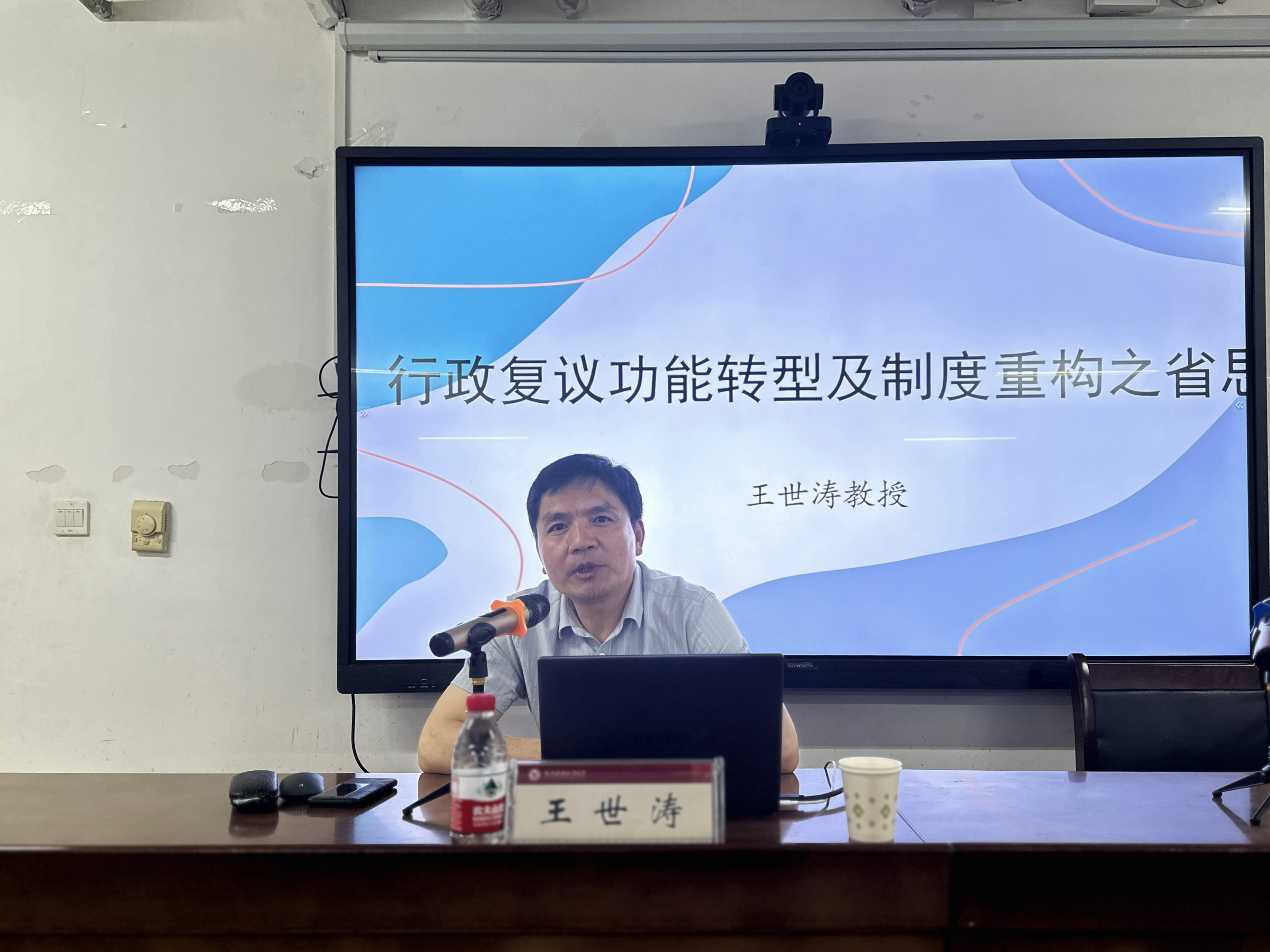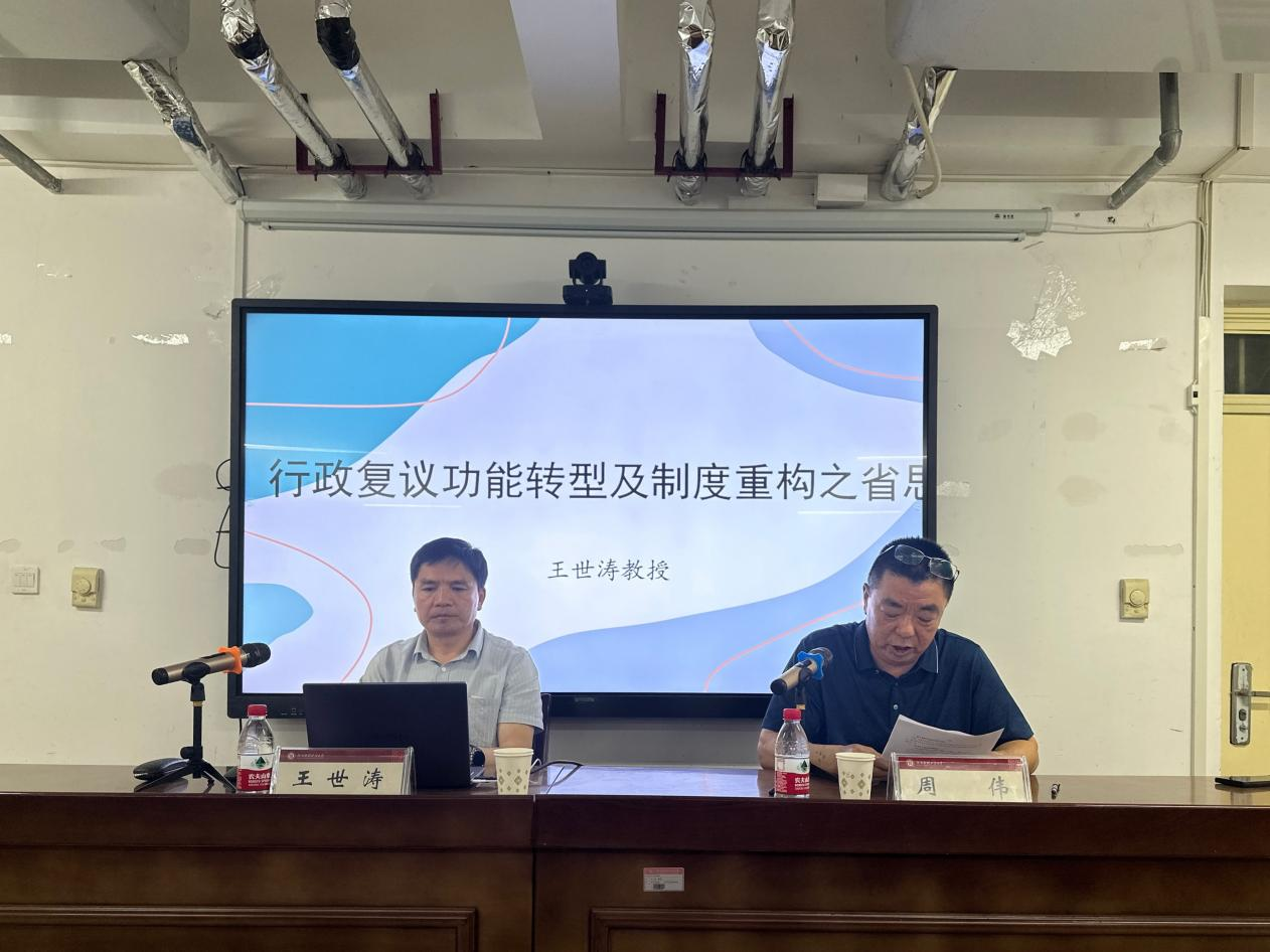 王世涛以“行政复议功能转型及制度重构之省思”为主题,首先指出新《行政复议法》针对以往实施过程中暴露的问题,后阐述了制度创新之处,如扩大行政复议范围、优化管辖体制、加强吸纳行政争议的能力等。其次,在功能转型方面,王教授强调,行政复议的基本功能为救济和监督,附加功能为化解行政争议。新法的实施意味着行政复议从内部层级监督机制向行政争议解决机制的重大转型,以满足国家治理和社会稳定的现实需要。王教授进一步分析了行政复议作为化解行政争议主渠道的价值功能及其面临的制度困境。他提出,尽管行政复议在不收费、快捷性、专业性等方面具有优势,但其公正性较弱,且与行政诉讼和信访相比存在不足。针对行政复议的制度重构,王教授提出了一系列建议,包括全面调解的审慎应用、管辖权的相对集中以及咨询型行政复议委员会的确立。他还对行政复议前置的扩容及其潜在问题进行了批判性分析,并提出了优化行政复议制度的多项建议。最后,王教授强调行政复议的司法化是提升公信力和化解争议功能的关键。随后,周伟教授对本次讲座进行了总结,并与王世涛教授进行了深入交流。