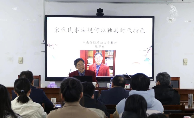 陈景良以《宋代民事法规何以独具时代特色》为题,从传世文献、判例等资料入手,用风趣幽默的语言、丰富多彩的事例,深刻阐释了宋代民事法规的最大特色即立法形式多样、内容丰富多彩,分析了形成这些时代特色的历史原因,提出了“无论是西方还是中国,法律都源于(社会)生活,权利皆长于(历史)实践”的论断。报告结束后,他还分别就古代律典蕴含的诉讼精神、古代民事法规的学理解释及其当代意义、知识—理论—方法“三结合”的学术路径和程政举教授、陈鹏飞教授进行了交流。